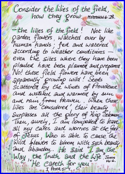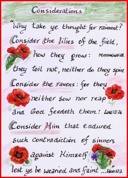 "And why take ye thought for raiment? Consider the lilies of the field, how they grow; they toil not, neither do they spin: And yet I say unto you, That even Solomon in all his glory was not arrayed like one of these. Wherefore, if God so clothe the grass of the field, which today is, and to morrow is cast into the oven, shall He not much more clothe you, O ye of little faith?......But seek ye first the kingdom of God, and His righteousness; and all these things shall be added unto you."