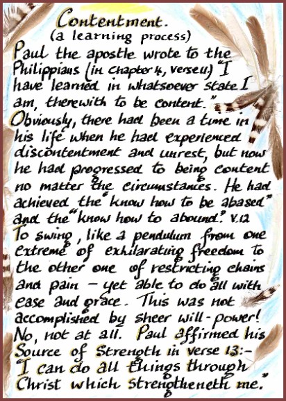 "Not that I speak in respect of want: for I have learned, in whatsoever state I am, therewith to be content. I know both how to be abased, and I know how to abound: every where and in all things I am instructed both to be full and to be hungry, both to abound and to suffer need. I can do all things through Christ which strengtheneth me. But my God shall supply all your need according to His riches in glory by Christ Jesus."