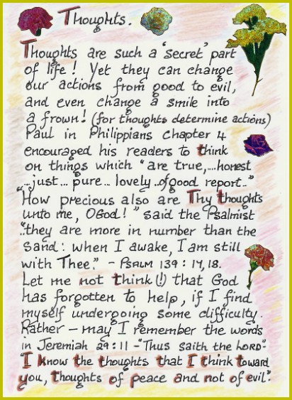 "Be careful for nothing; but in everything by prayer and supplication with thanksgiving let your requests be made known unto God. And the peace of God, which passeth all understanding, shall keep your hearts and minds through Christ Jesus. Finally, brethren, whatsoever things are true, whatsoever things are honest, whatsoever things are just, whatsoever things are pure, whatsoever things are lovely, whatsoever things are of good report; if there be any virtue, and if there be any praise, think on these things."