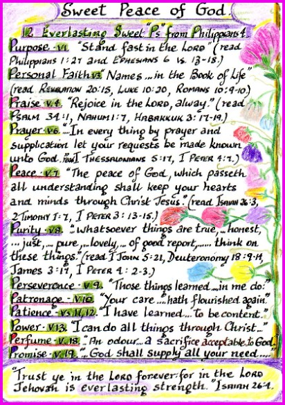 "Rejoice in the Lord alway; and again I say, Rejoice. Let your moderation be known unto all men. The Lord is at hand. Be careful for nothing; but in every thing by prayer and supplication with thanksgiving let your requests be made known unto God. And the peace of God, which passeth all understanding, shall keep your hearts and minds through Christ Jesus."