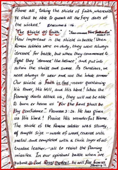 "Finally my brethren, be strong in the Lord, and in the power of His might. Put on the whole armour of God, that ye may be able to stand against the wiles of the devil. For we wrestle not against flesh and blood, but against principalities, against powers, against the rulers of the darkness of this world, against spiritual wickedness in high places......Above all, taking the shield of faith, wherewith ye shall be able to quench all the fiery darts of the wicked."